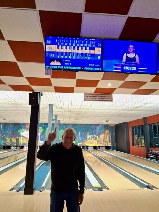 Phil and the girls’ lane was playing up so they were a few frames behind. With a score of 127 on the 8th frame Phil could have toppled my crown but as a few of us had gathered round we put the pressure on and the cough, as he was about to bowl, might have helped - he