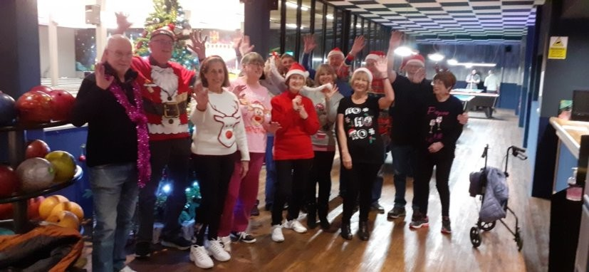 On a less than cheerful note, we were saddened to hear recently that our number 1 supporter, Polly, had passed away. Unable to bowl herself, Polly was brought along to our bowling sessions by two members. She enjoyed our strikes as much as we did, she would laugh with us, enjoy the music and sometimes, have a glass or two of wine. At Christmas Polly joined us and sported her Christmas jumper, as seen at the far right of the photograph below. Some said she was our lucky mascot; whatever she was we will all miss Polly.