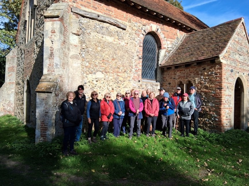 11 of us met at the Warren Golf Club, Woodham Walter, ordered our lunch and jauntily set of north-east along a green lane that emerged at the playing fields close to the church and the Bell pub. Here two more walkers joined us; they are in training for their planned walk next year walking the Camino de Santiago. We were all travelling ‘light’ but they had weighted rucksacks and walking poles to give a more authentic experience.